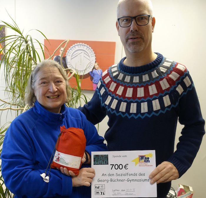 Am 8.1.26 besuchte Frau Scholl vom Verein Letter-Fit e.V. unsere Schule und überreichte Herrn Beker stellvertretend für den Sozialfonds der Schule eine Spende in Höhe von 700 Euro. Die Spendeneinnahmen stammen aus dem lebendigen Adventskalender.